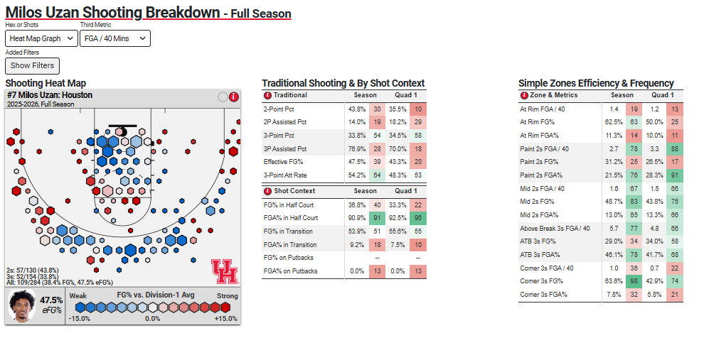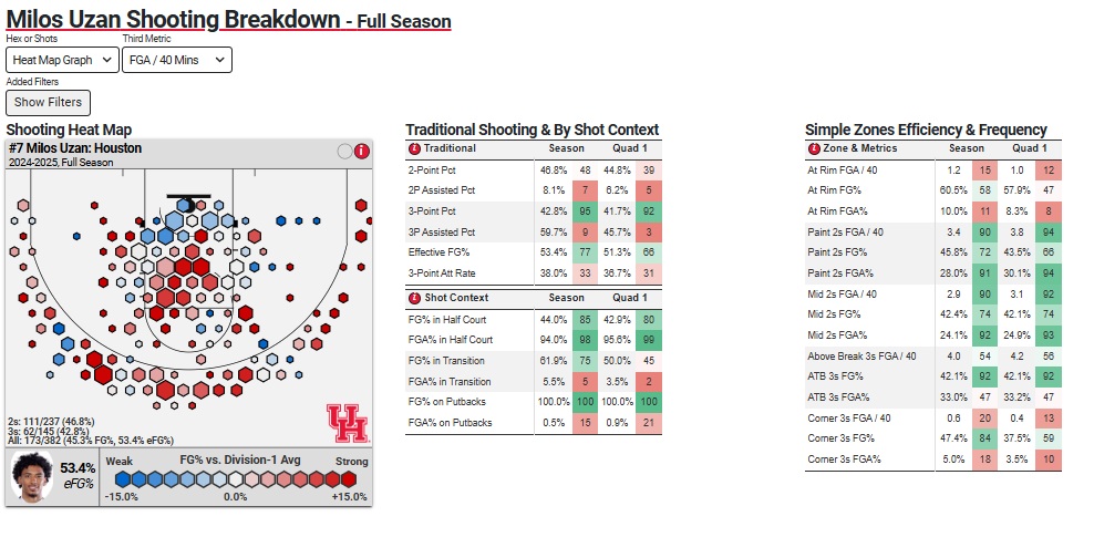Uzan, one thing that stands out to me, last year 38% of his shots were 3s, this year 54%. Last year eFG% vs Q1 teams 51% its 43% this year.