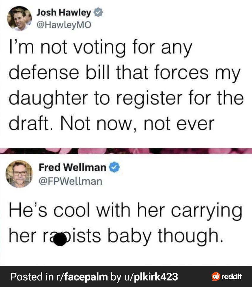 Of course thereās no draft, but the point is, a lot of people donāt want women to be registered/have to register, and want them to never even be considered in any future draft. As long as they are registered, they are under consideration, of course, and thatās anathema to those people.