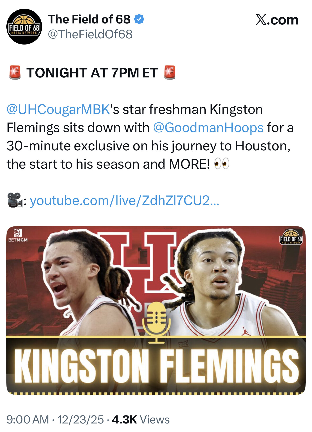 In terms of raw talent, Flemings is one of the most talented UH freshman I’ve seen. His play making ability and defensive skills were ahead of Shead at the same age. His decision making will get better over time. He may grow taller and definitely become more stronger. Exciting player. He’s going to close out more games as we head to March.