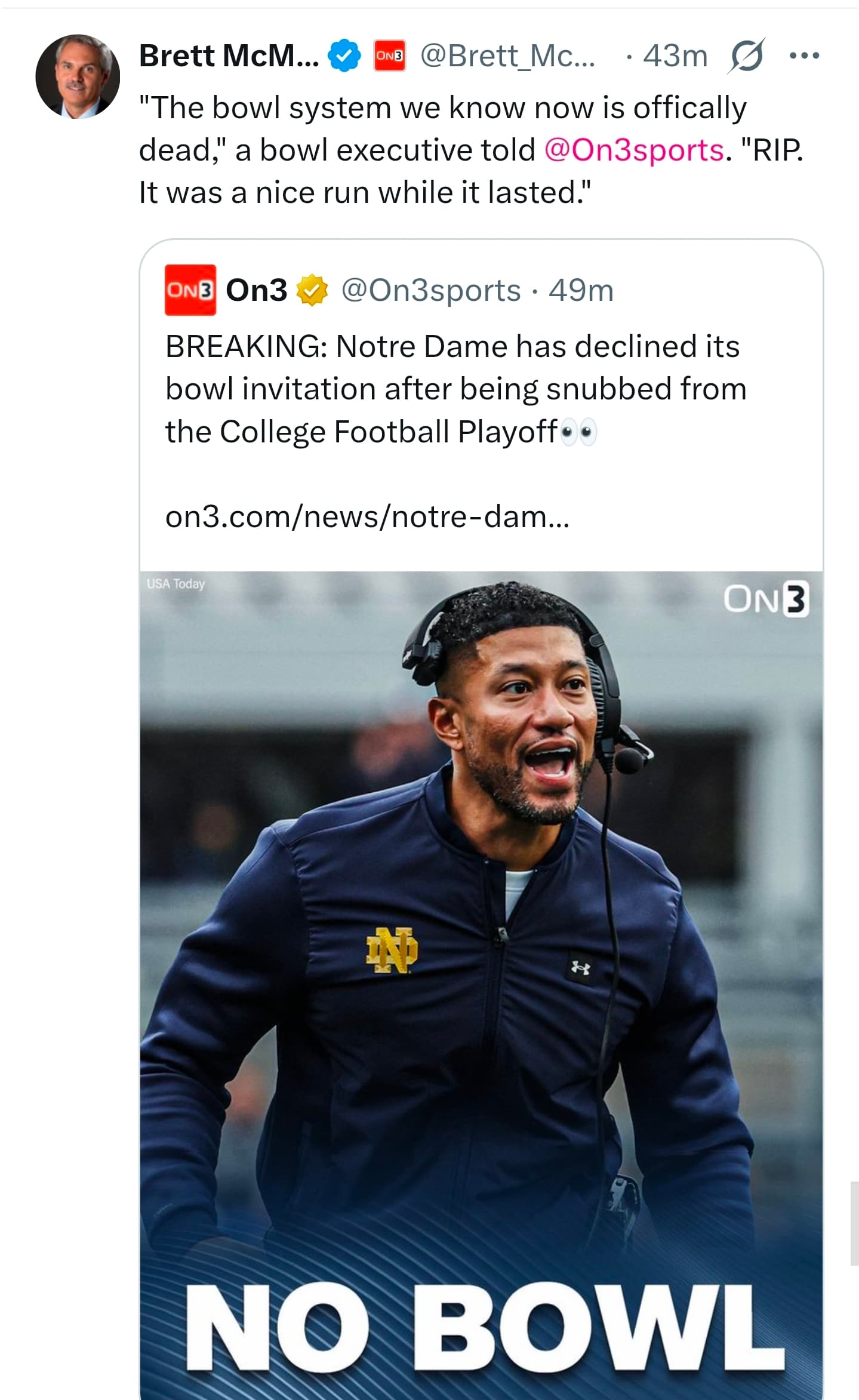 "The bowl system we know now is offically dead," a bowl executive told @On3sports. "RIP. It was a nice run while it lasted." https://t.co/2ucqdsmCfW