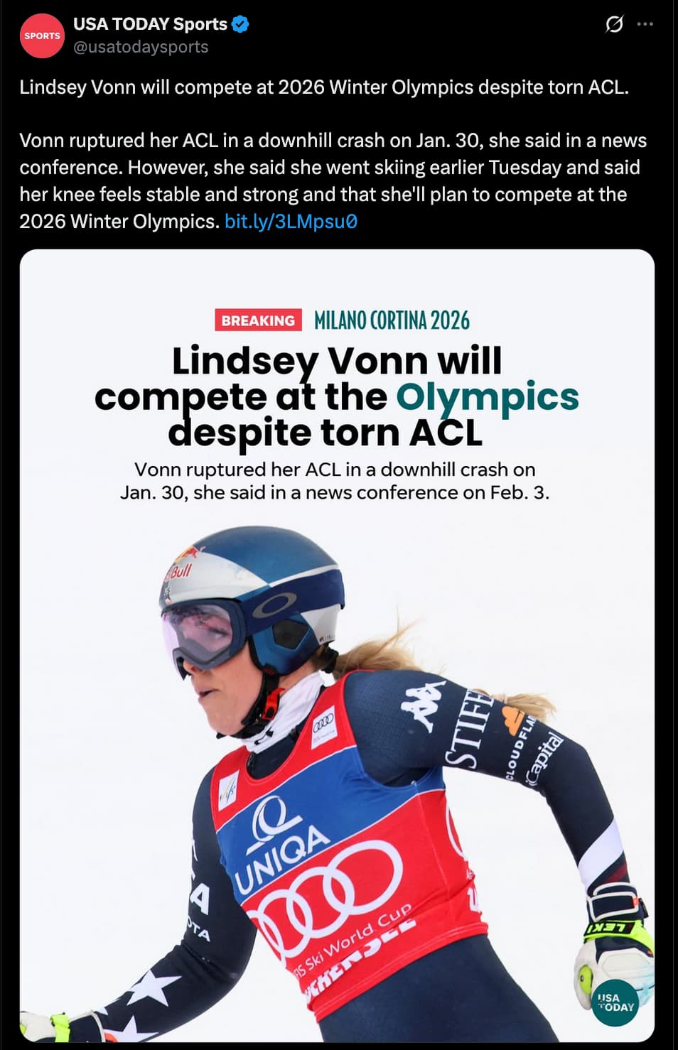 She EARNED IT Others wanted to make the Olympics? They had to be better than her, They were not. I love that she wants to have a go at it. JLCoog if you look at her āresumeā you will see that she competed with all kinds of injuries. The good news is that she knows the course with her eyes closed. The bad news is she canāt compete without doing the practice runs. She has to do them to reinforce her courseās intel. Only then can we be sure she can actually compete. Can her ACL be āmanageableā enough for race day? We will know more.