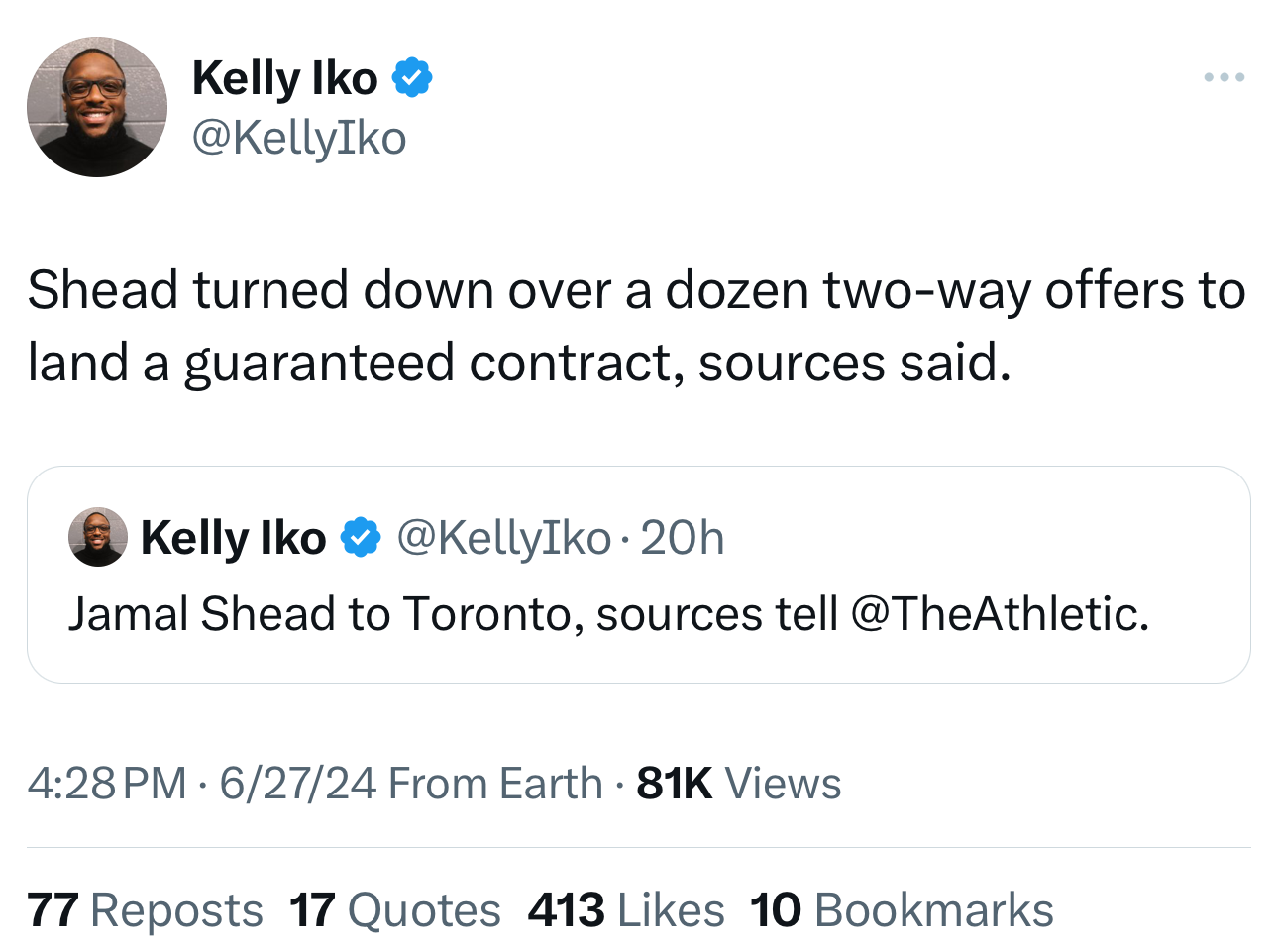 Just heard Shead got a GUARANTEED deal! He was right on the fringe on getting only a two-way but this is much better. Reported by Kelly Iko of the Athletic