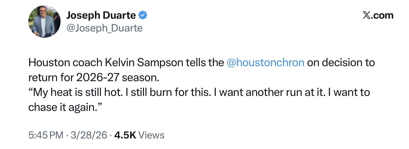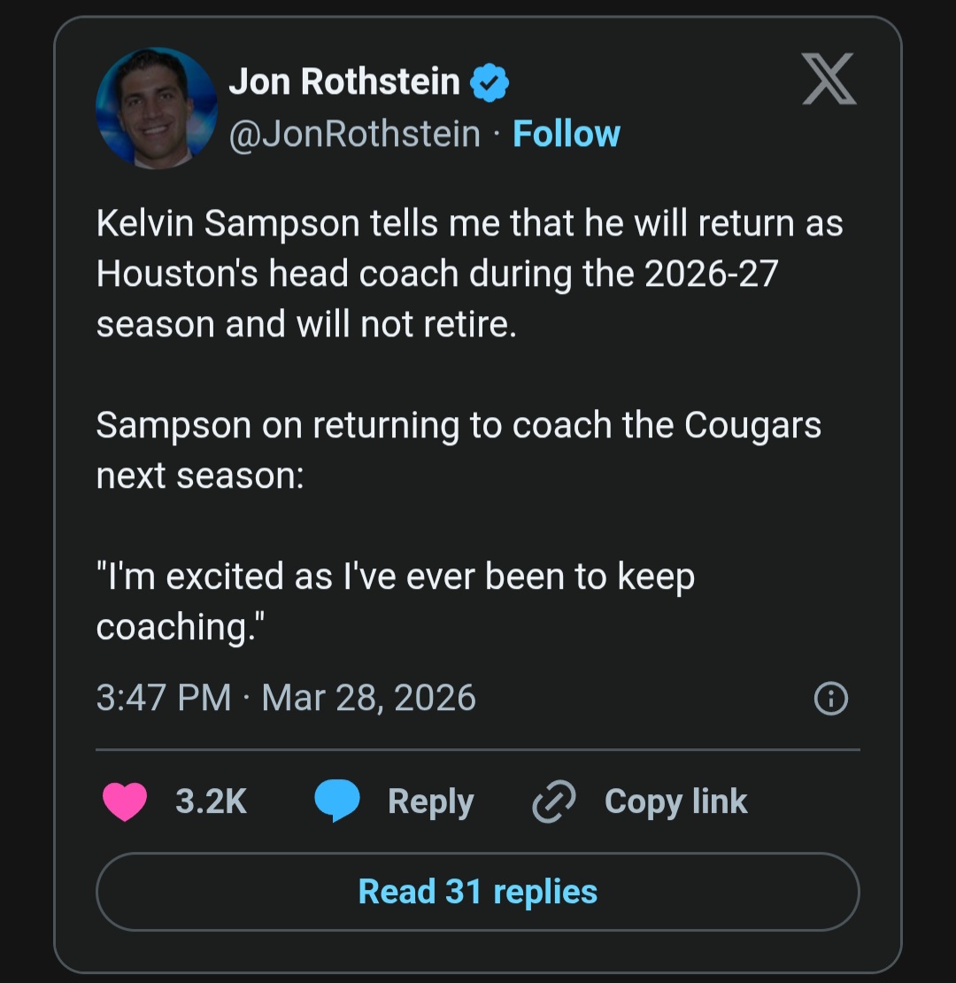 Amid speculation that he could be retiring, Kelvin Sampson will indeed be returning to Houston for his 13th season. CBS Sports’ Jon Rothstein reported the news.