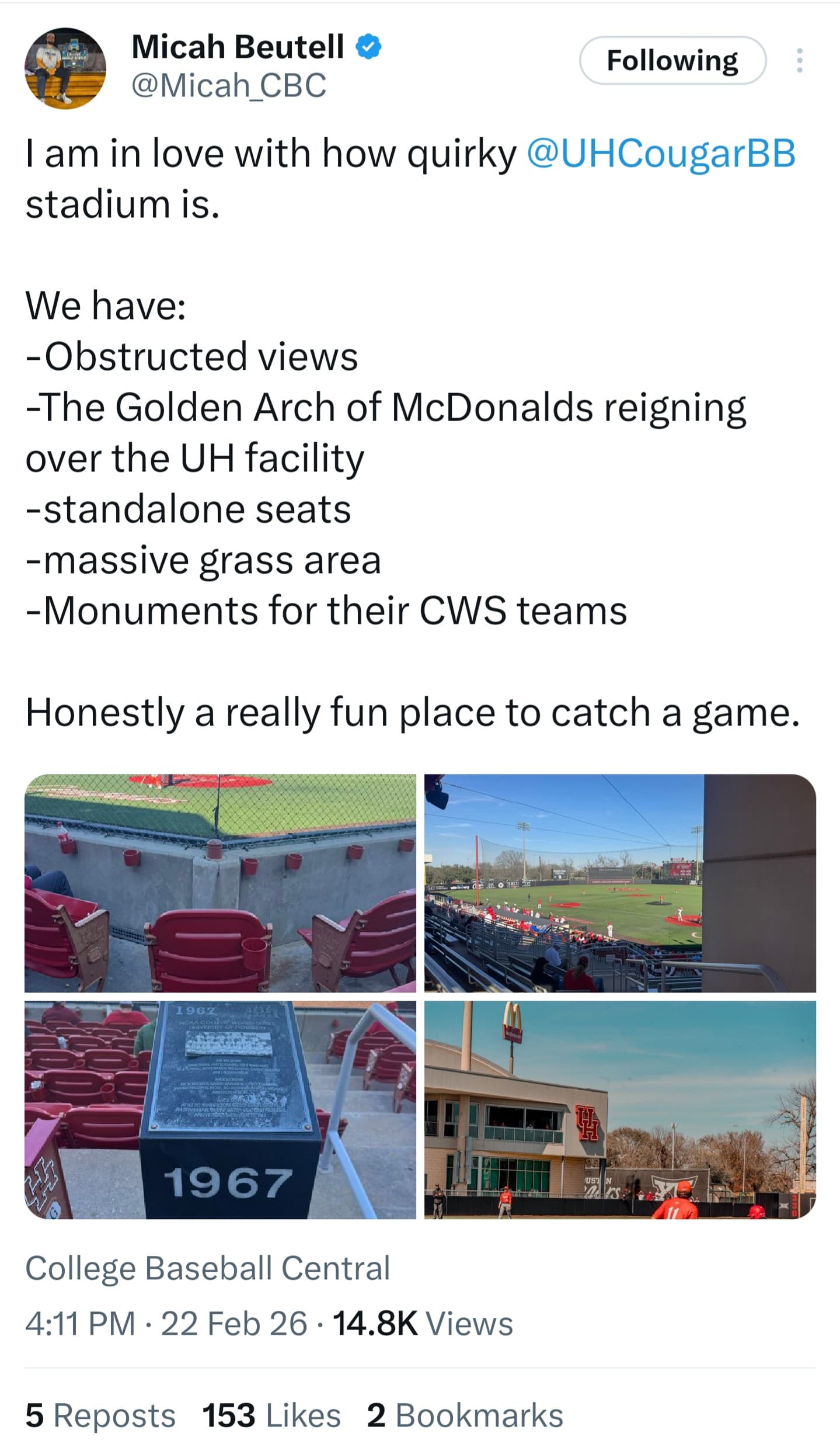 I’ll let you know. I have been to Rice, Houston Victoria, and UH baseball parks. That’s all as far as college level. I don’t have as much experience as I do with football and basketball venues.