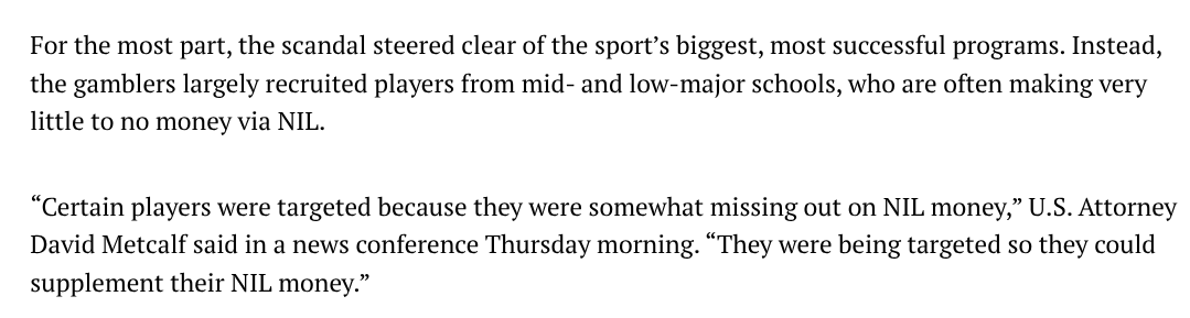 I myself have ZERO confidence that the NCAA can solve its own problems. If the NCAA isn’t inept and corrupt, it would drop a huge hammer on every single school involved, decimate their programs, and bar all the athletes from further competition. I know it would be a harsh and nasty punishment but you would only have to do it ONE time.