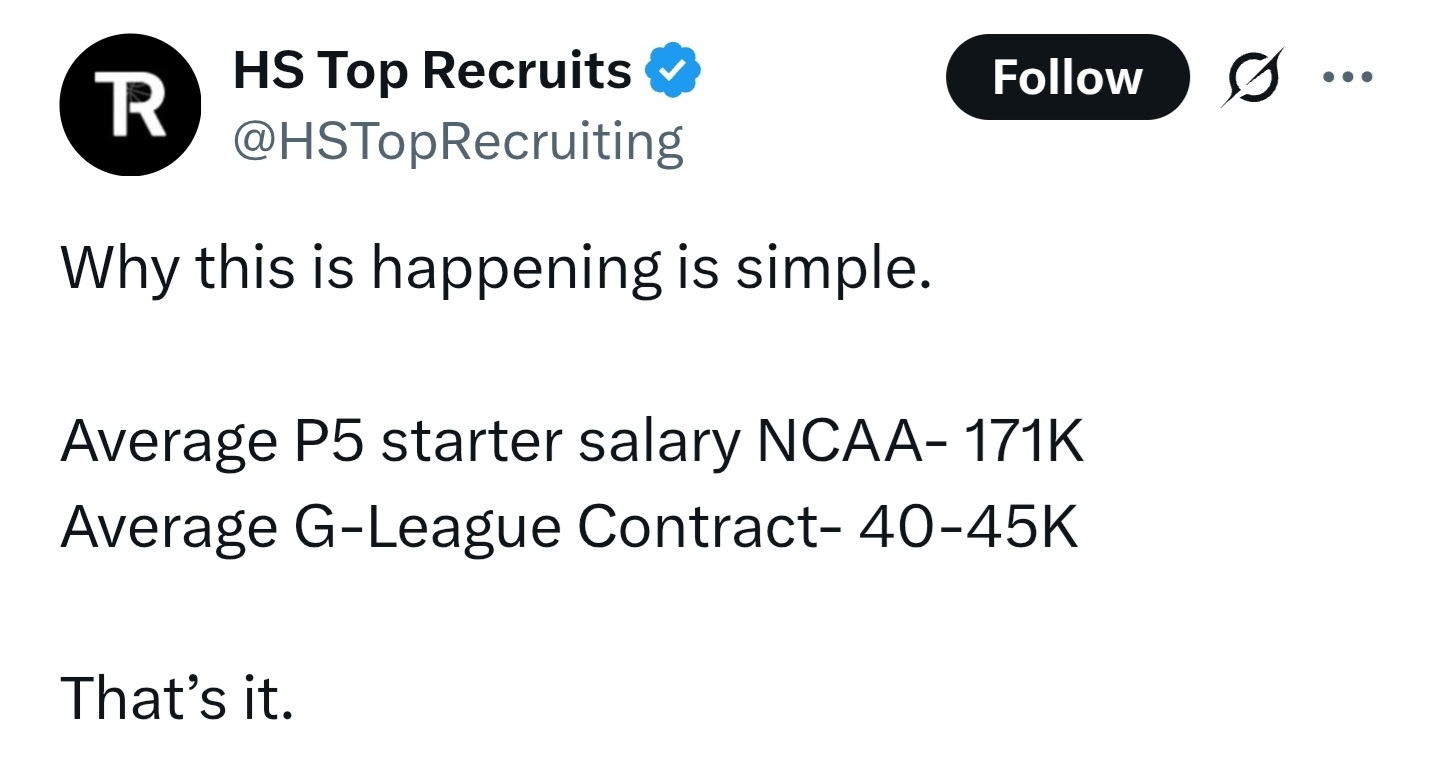Signing G-League players takes away ships from high school and college transfers. Doubtful most G-League players are interested in academics. It’s basketball and NIL for them. Do you want your locker room with that type of player?
