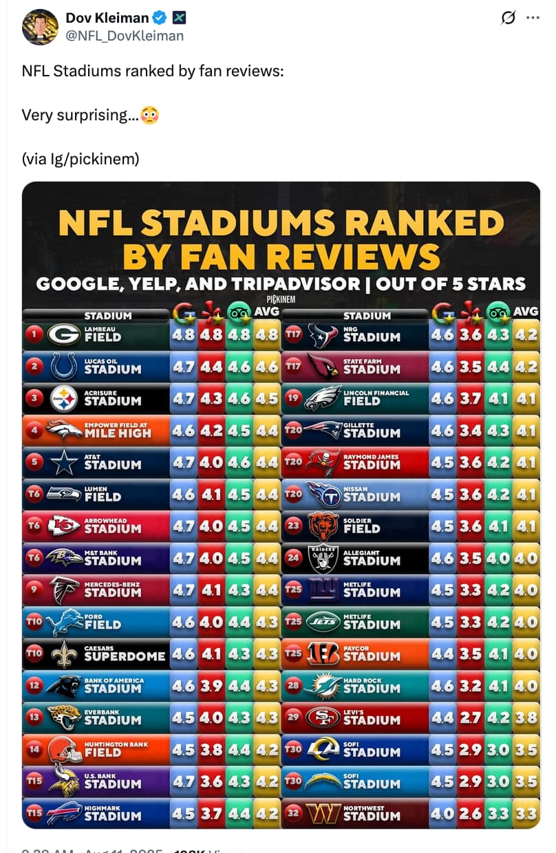 This poll shows popular website ratings of Google, Yelp, and Trip Advisor of NFL Stadiums, and then averages them for the list. NRG is in the middle.