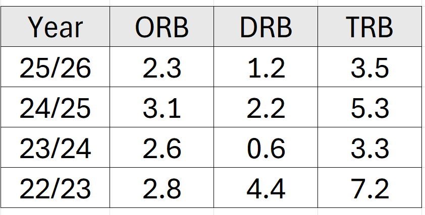 I thought so too, but the numbers don’t agree. ORB per game the last 4 years