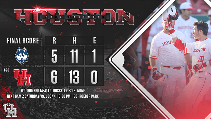 Houston Baseball out hit UConn, 13-11, in the game. The Cougars used four extra-base hits as Corey Julks led the offense with a 4-for-4 effort, a run and two RBI. Connor Wong belted his 10th home run, Jake Scheiner tripled and Jared Triolo came up huge with a double in the 10th inning.
