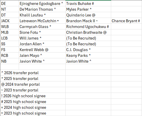 Edit: From the comments, Replaced Zavian Tibbs with Quindario Lee, made Brandon Mack II the back up Jack and bumped Chance Bryant to third string, made Carmycah Glass the starting WLB and Richmond Ugochukwu the back up, made Christian Brathwaite the back up MLB, and removed Blake Thompson,