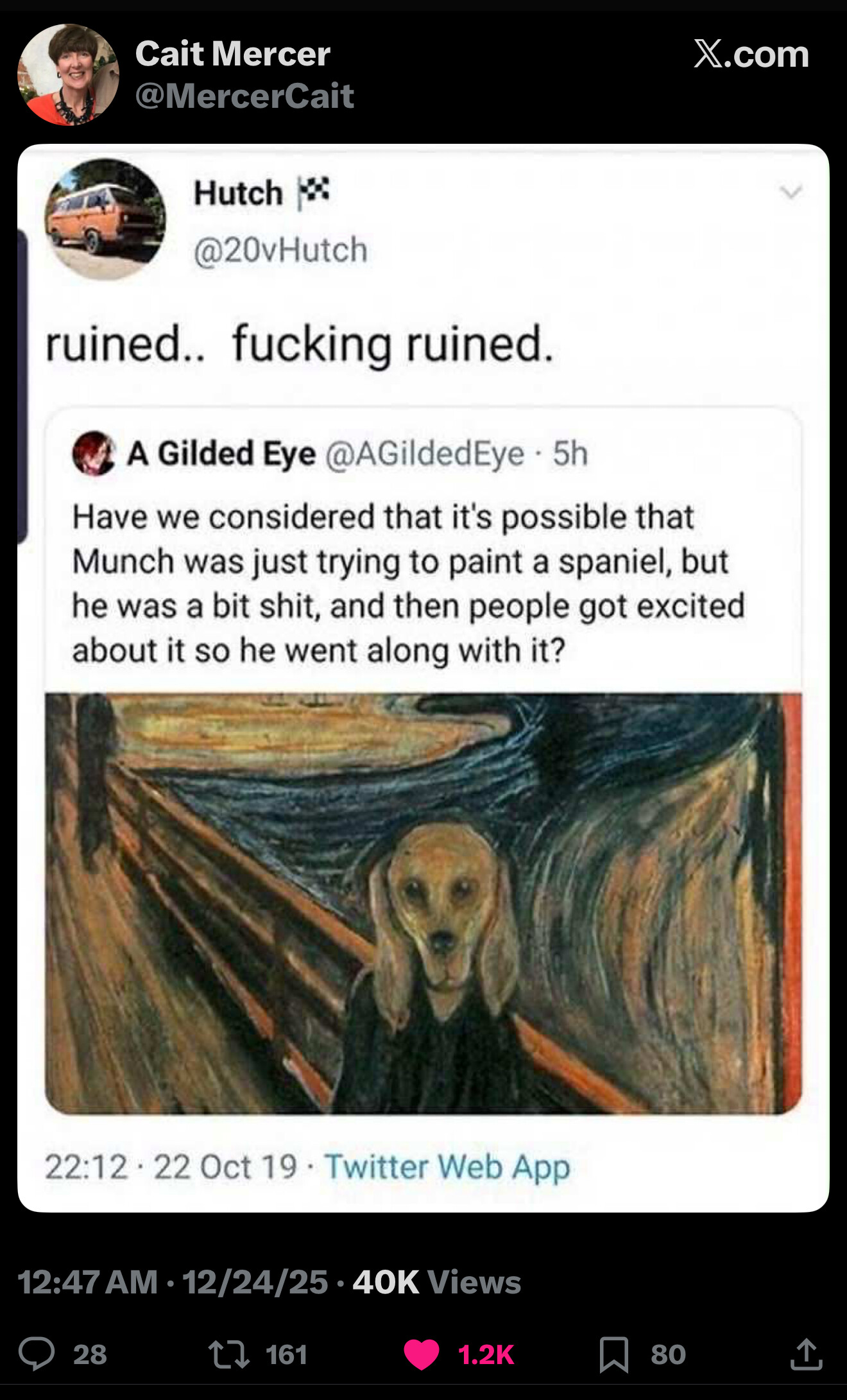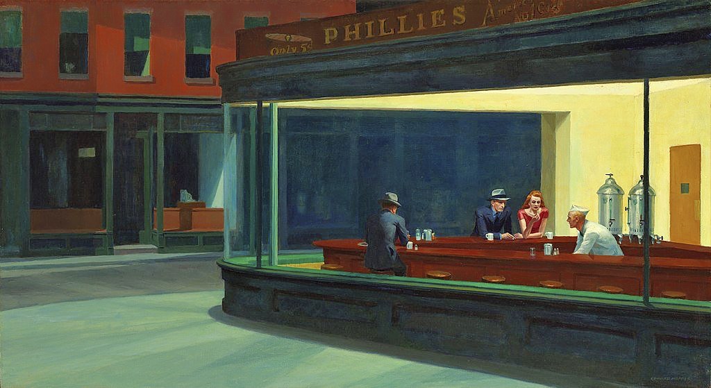 Nighthawks is a 1942 oil on canvas painting by the American artist Edward Hopper that portrays four people in a downtown diner late at night as viewed through the diner’s large glass window. The light coming from the diner illuminates a darkened and deserted urban streetscape. (Wikipedia)