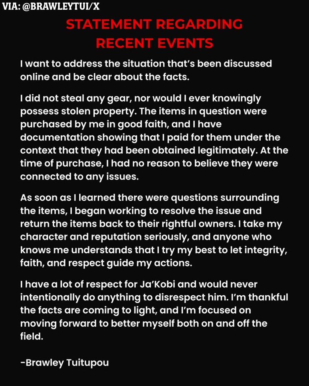 He wraps up his statement, which was noticeably ambiguous, with…. “I’m trying to better myself both on and off the field”.