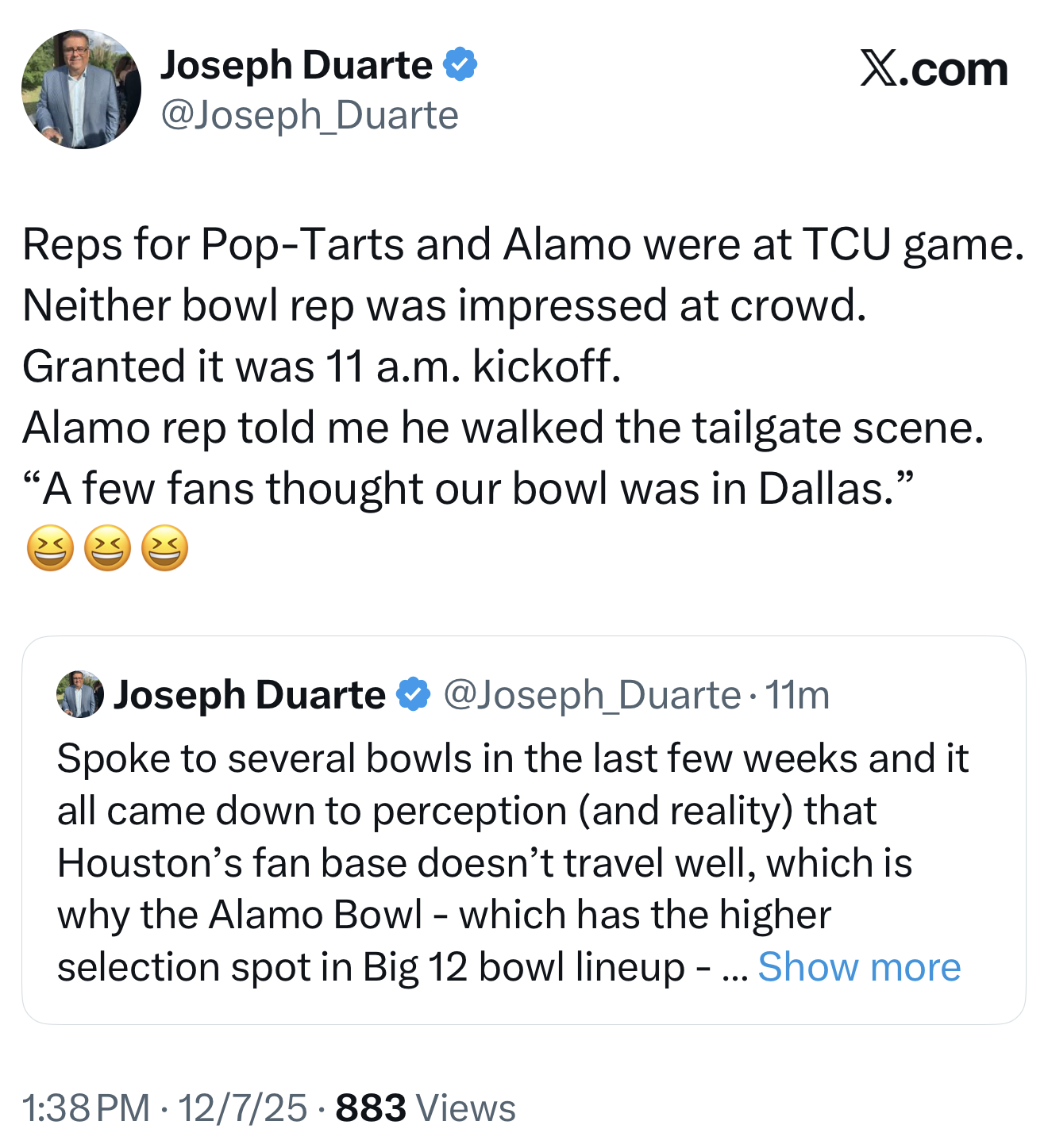 Wait⦠TCU was a 3PM kick. And feels like that Alamo rep is embellishing a lot with that comment.