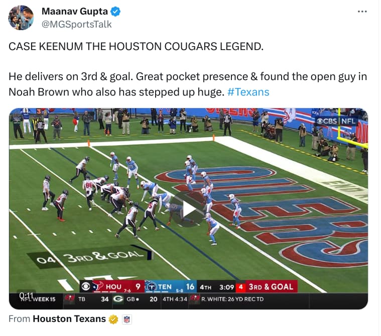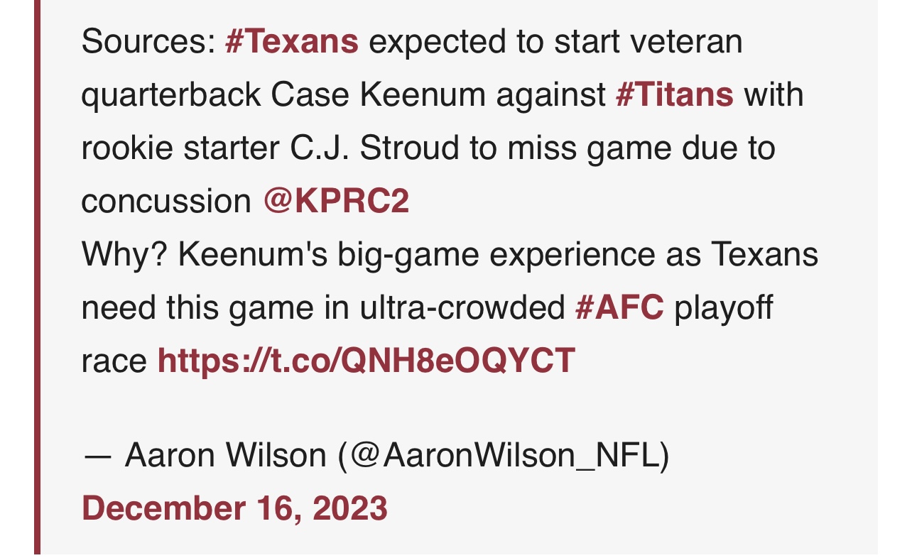 Why? Keenum’s big-game experience as Texans need this game in ultra-crowded #AFC playoff race