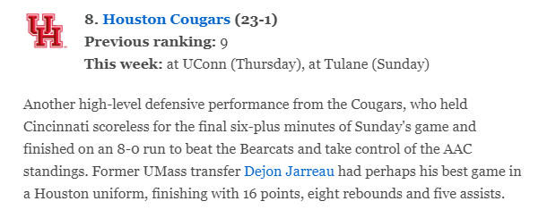 UH should jump Nevada to be honest. I can see a #8 ranking but I doubt it in the AP.