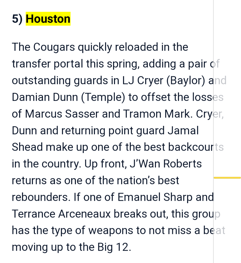 It amazes me the red color glasses people have. With the team we have, it will be a struggle in b12. Miracles can happen but literally it will be that. Francis was more a lower half player in AAC, Roberts have been highly inconsistent and I felt that end of the season he was barely there. That’s your front end and some freshmen. Good luck.