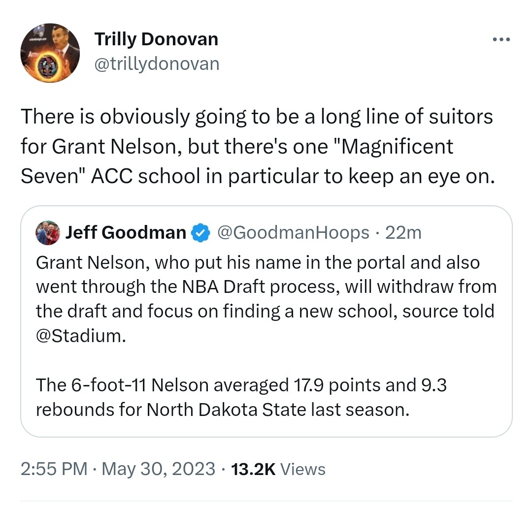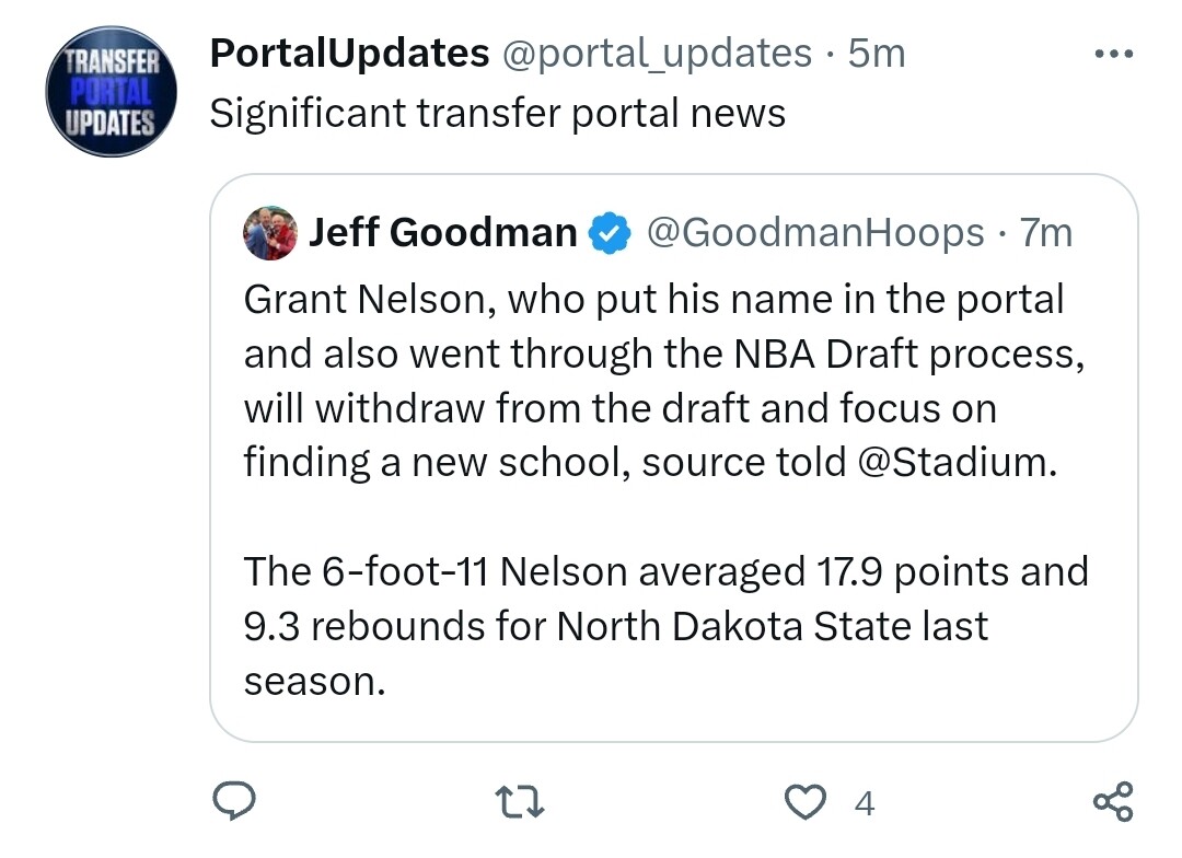 Grant Nelson, one of the best available in the portal, is withdrawing from the NBA Draft.