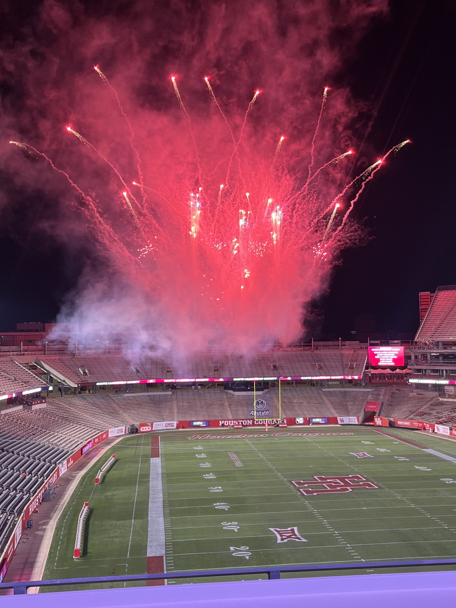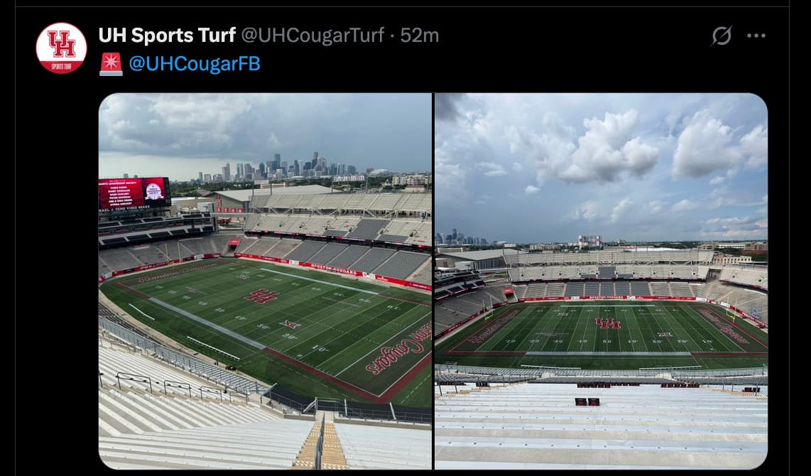 Not my favorite look in the world — I’m a much bigger fan of just “Houston,” or “Houston” at one end and “Cougars” at the other, and I like white text on a red background more than I do red text on a blank (green) background — but ultimately not much to object to here. Really, as long as it’s UH and not the word mark at midfield, I’m not gonna do a ton of complaining.