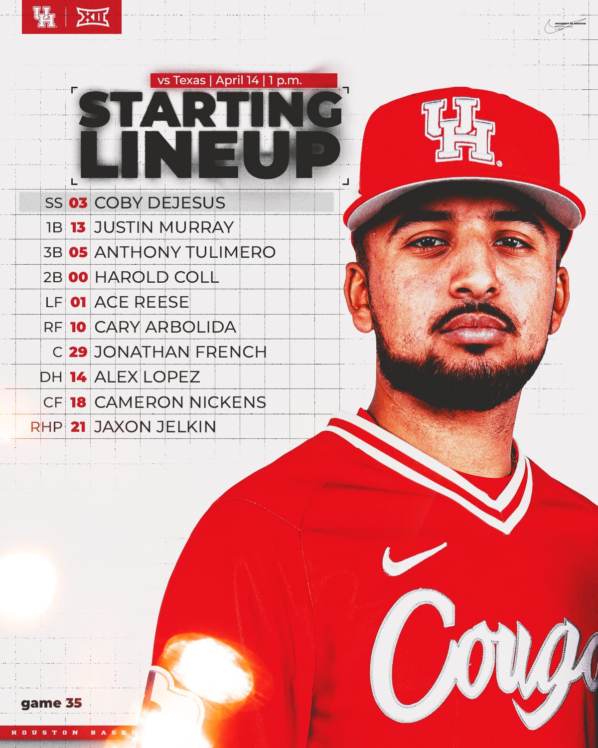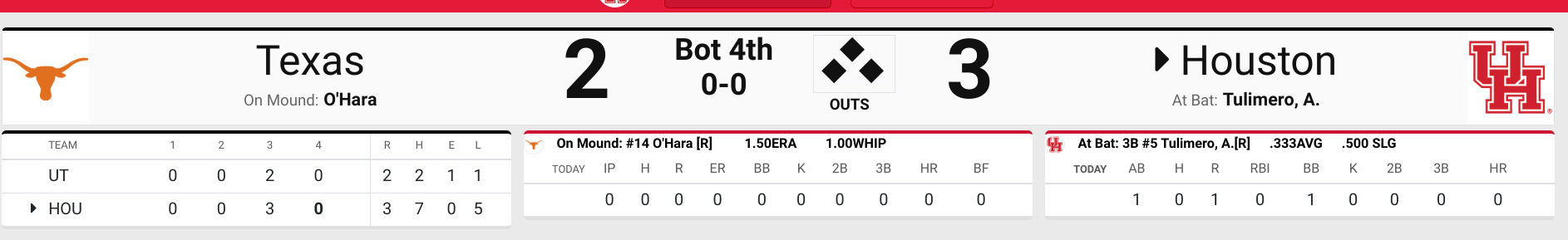 5-2 Coogs with 1 out and runners on 2nd and 3rd. Horns going to the pen again