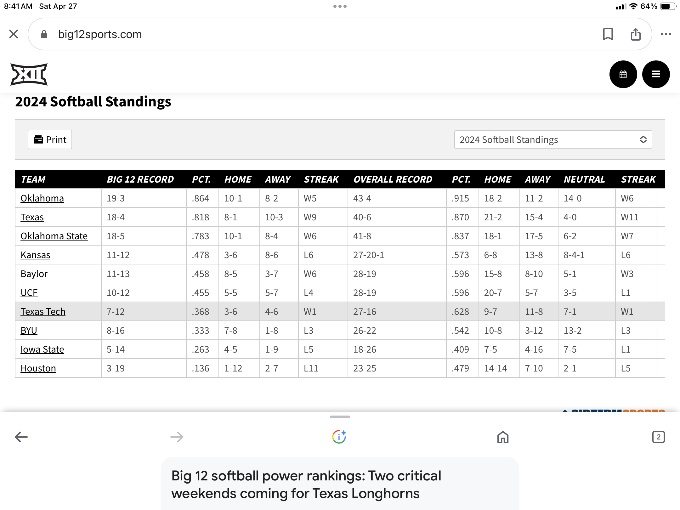 So, we’re 20-6 outside the Big 12? Boy, that must be some bad teams. We’ll probably get some more Big 12 wins next year when the teams that are 37-7 leave and we bring in Utah, ASU, UofA and CU which currently combine for 24-42 in the Pac12 standings. CU doesn’t have a team.