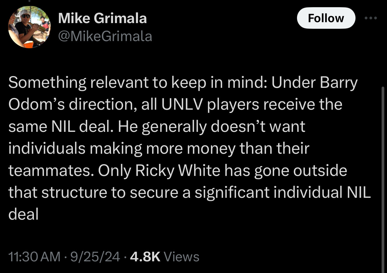 For team NIL deals, I agree with UNLV Head Coach Barry Odom’s position to divide the payment evenly among the team. I can’t imagine he would interfere with a NIL deal between a business and individual player; or would he? If so, I can see why better players would not go to UNLV.