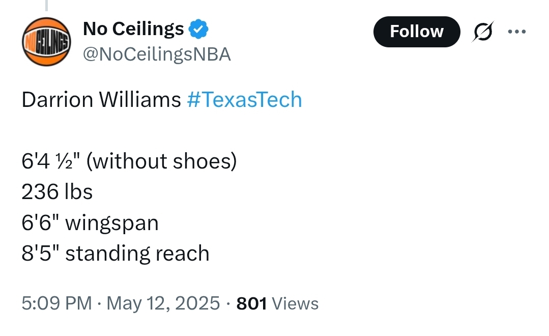 Darrion Williams, only 6’4" ish. With a 6’6" wingspan. Not our type of player. 236 lbs ![]()