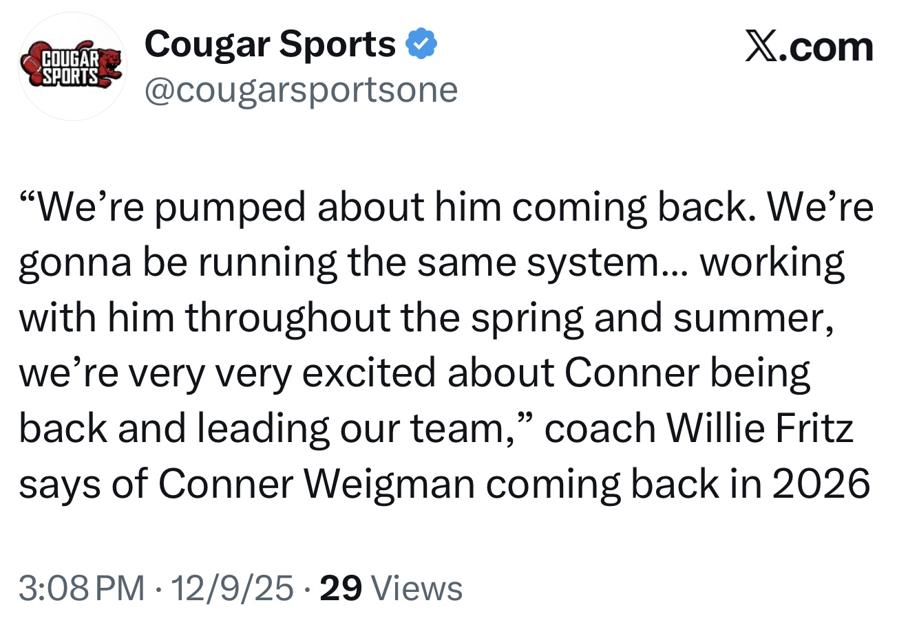 And Weigman led a team like Houston that was 4-8 for two years in a row to a 9 win season. Just as big of a feat. And this next year we can do even better.