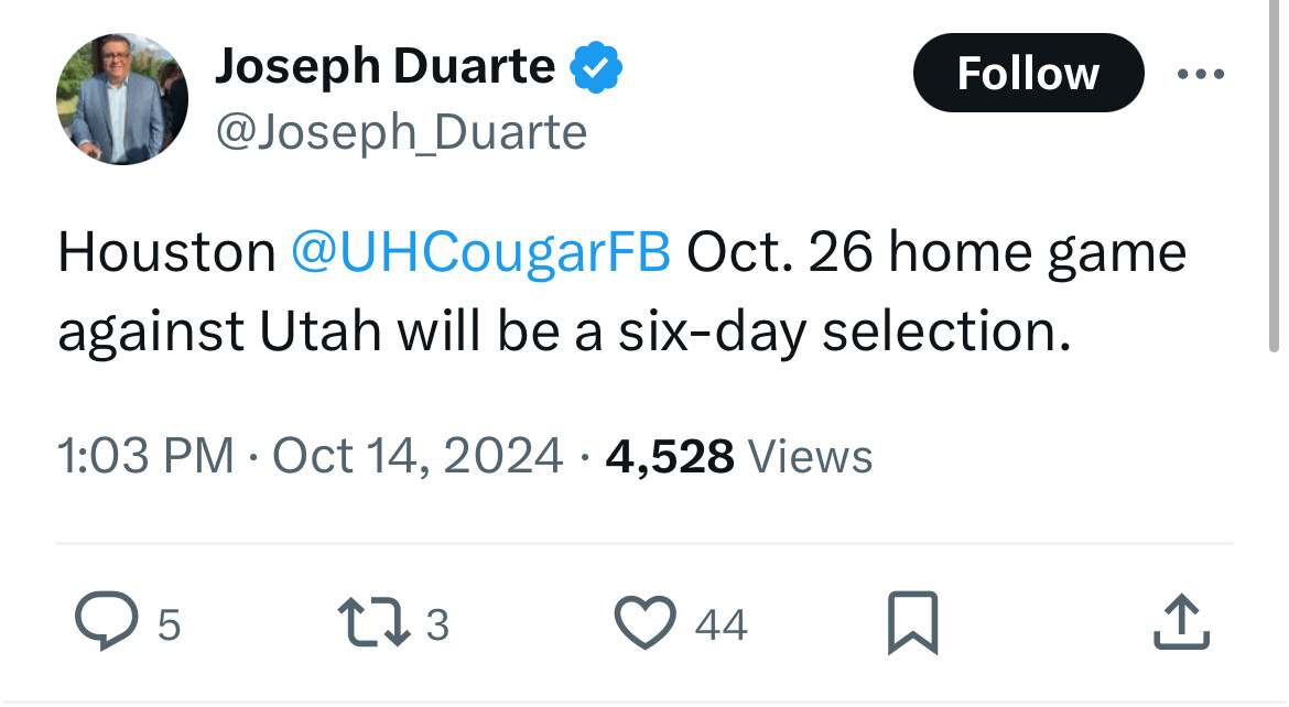 If it doesn’t not work that way, why are big games always on prime stations at prime times. Games that conferences are trying to fill in will usually end up off times with smaller channels. Our rating were up with TCU because we were the only game on. They will wait 6 days out to see where to put us.